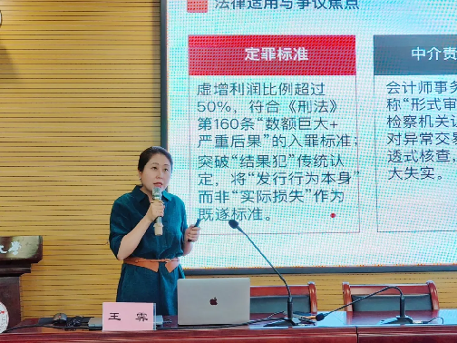 王霁老师以“最高检指导案例研讨:欺诈发行债券的法律规制”为授课主线,系统解读公司治理中欺诈发行的构成要件、法律后果及责任体系。通过深度剖析典型案例,聚焦资本市场虚假披露、中介机构失职等实务难题,梳理司法裁判对市场秩序的维护逻辑,凸显法律对诚信原则的刚性保障,展现法治对资本市场健康发展的引领作用。